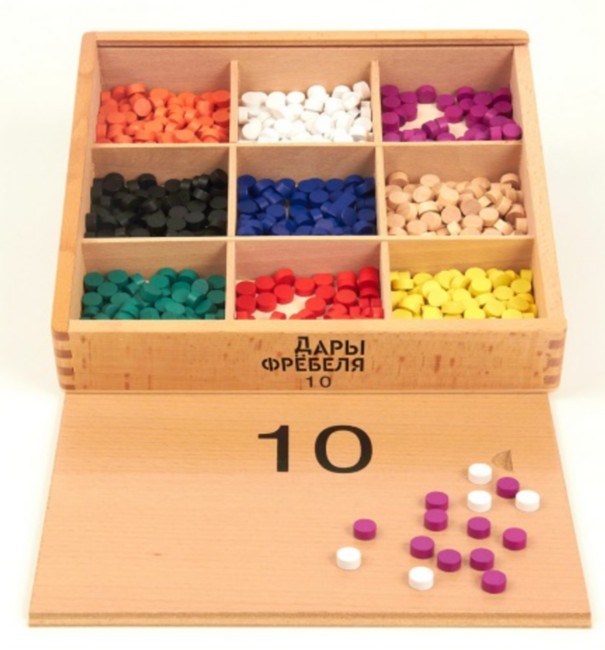 Взрослый высыпает фигуры из куба и предлагает ребенку посчитать количество. Он может откладывать десятки или считать подряд – в зависимости от навыков. Когда ребенок научиться считать, можно сравнить количество фигур в разных дарах. В каком кубе больше всего? В каком – меньше?