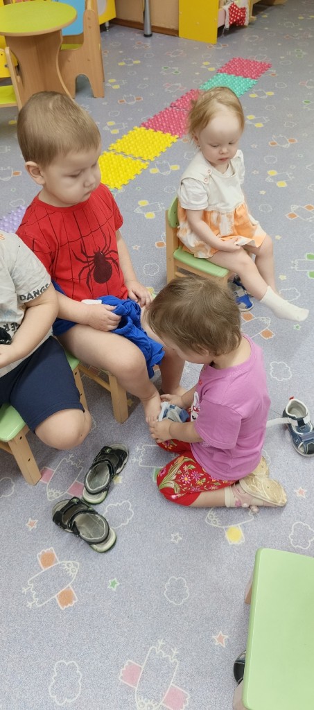 В нашей группе мы уделяем особое внимание развитию навыков самообслуживания. Воспитатели создают условия для самостоятельного одевания. Одежда развешивается так, чтобы малышам было удобно ее доставать. Каждый ребенок получает внимание и поддержку в освоении этого навыка. Здесь важен индивидуальный подход. Мы так же используем различные игры.